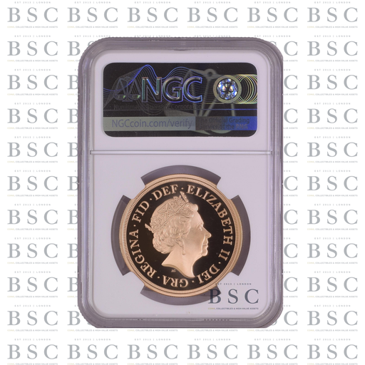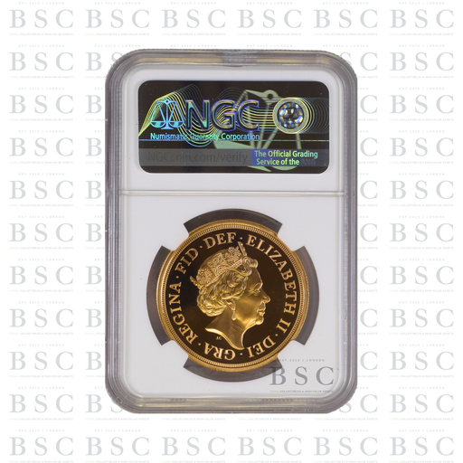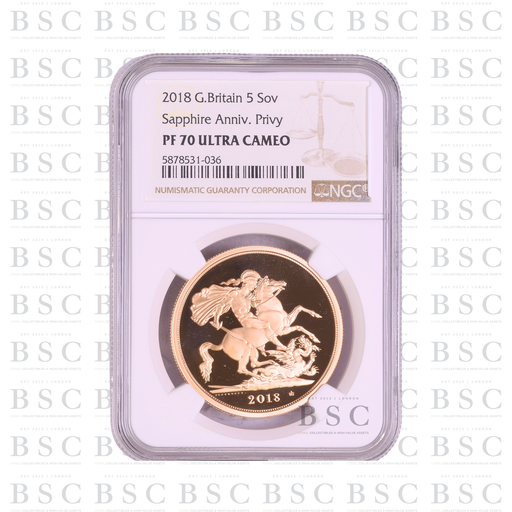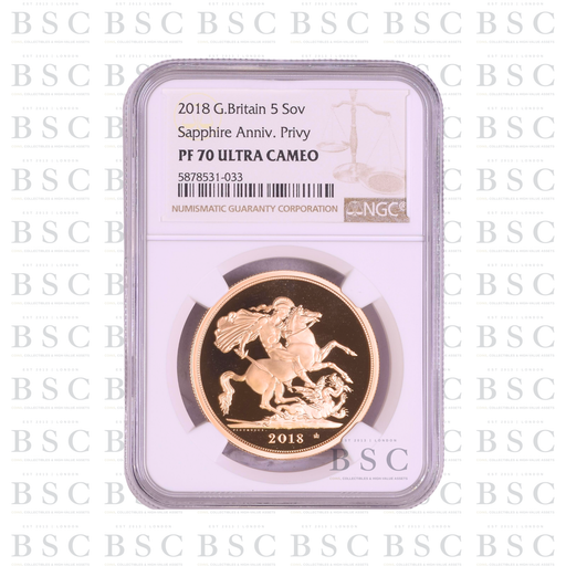 2018 GB £5 Quintuple Sovereign Sapphire Anniversary Gold Proof Coin. Graded PF69 Ultra Cameo by NGC. NGC Certification Number: 5878375-001 Exact ...