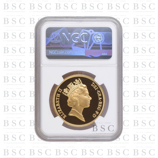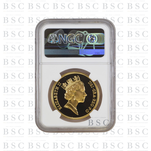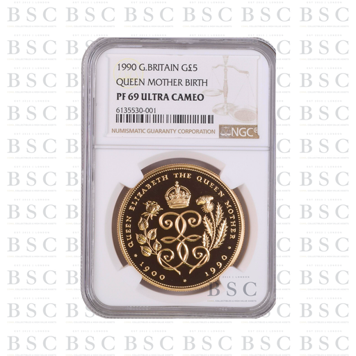 1990 GB £5 Quintuple Sovereign Queen Mother Birth Gold Proof Coin. Graded PF69 Ultra Cameo by NGC. NGC Certification Number: 6135530-001 Exact co...