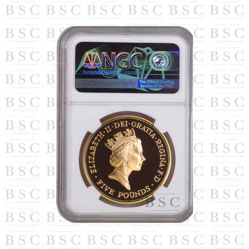 2000 £5 Quintuple Sovereign St George Proof Gold Coin. Graded PF69 Ultra Cameo by NGC. NGC Certification Number: 6063014-010 Exact coin pictured....