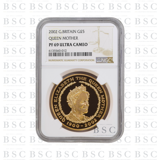 2002 GB £5 Quintuple Sovereign Queen Mother Gold Proof Coin. Graded PF69 Ultra Cameo by NGC. NGC Certification Number: 6135560-012 Exact coin pic...