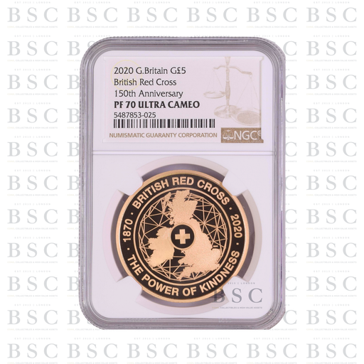2020 GB £5 British Red Cross Proof Gold Coin. Graded PF70 Ultra Cameo by NGC. NGC Certification Number: 5487853-024 Exact coin pictured. Supplied...