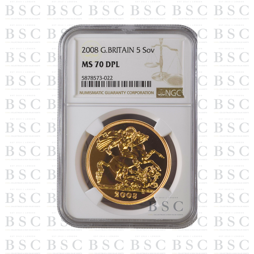2008 GB £5 Quintuple Sovereign Gold Coin. Graded MS70 DPL by NGC. NGC Certification Number: 5878573-022 Exact coin pictured. Supplied in original...