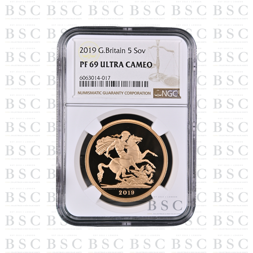 2019 £5 Quintuple Sovereign St George Proof Gold Coin. Graded PF69 Ultra Cameo by NGC. NGC Certification Number: 6063014-017 Exact coin pictured....