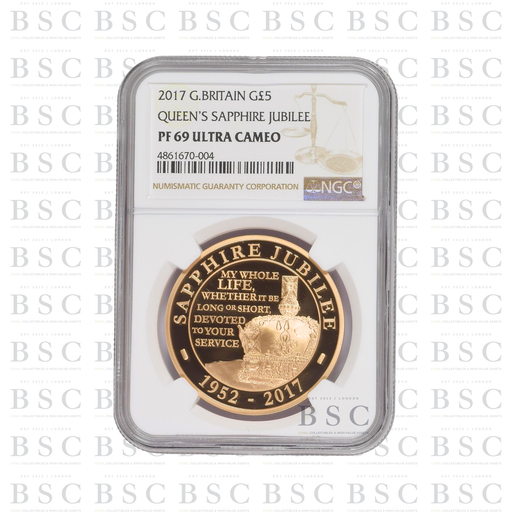 2017 £5 Queen’s Sapphire Jubilee Proof Gold Coin PF69 NGC