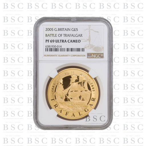 2005 £5 Battle of Trafalgar Proof Gold Coin. Graded PF69 Ultra Cameo by NGC. NGC Certification Number: 6381930-014 Exact coin pictured. Supplied ...