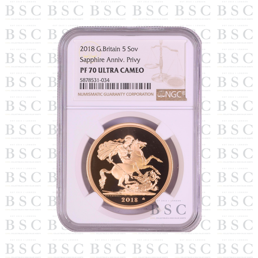 2018 £5 Quintuple Sovereign St George Sapphire Privy Proof Gold Coin. Graded PF70 Ultra Cameo by NGC. NGC Certification Number: 5878531-036 Exact...