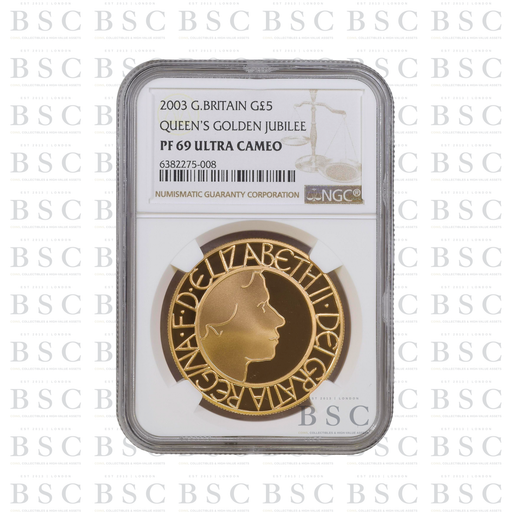 2003 £5 Queen’s Golden Jubilee Coronation Anniversary Proof Gold Coin. Graded PF69 Ultra Cameo by NGC. NGC Certification Number: 6382275-008 Exac...