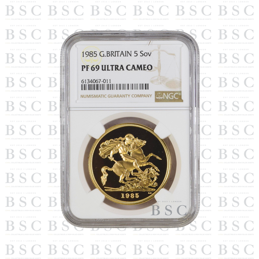 1985 £5 Quintuple Sovereign St George Proof Gold Coin. Graded PF69 Ultra Cameo by NGC. NGC Certification Number: 6134067-011 Exact coin pictured....