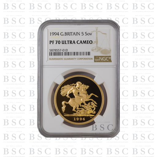 1994 £5 St George Quintuple Sovereign Proof Gold Coin. Graded PF70 Ultra Cameo by NGC. NGC Certification Number: 5878557-010 Exact coin pictured....