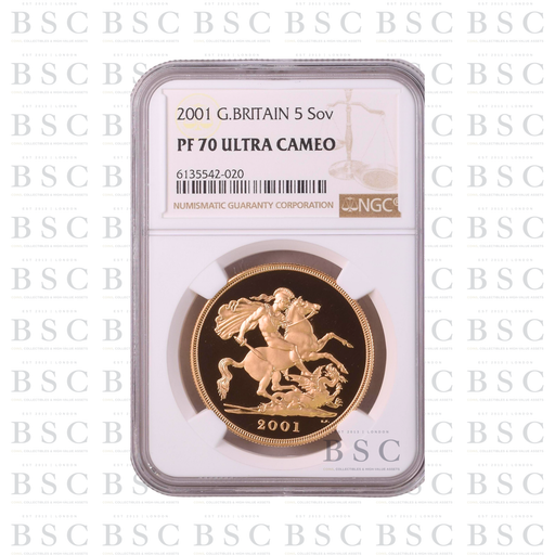 2001 GB £5 Quintuple Sovereign St George Gold Proof Coin. Graded PF70 Ultra Cameo by NGC. NGC Certification Number: 6135542-020 Exact coin pictur...