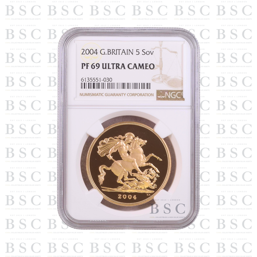 2004 £5 Quintuple Sovereign St George Proof Gold Coin. Graded PF70 Ultra Cameo by NGC. NGC Certification Number: 5878571-007 Exact coin pictured....