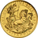 34.05g of 22ct/.917 gold (Actual Gold Weight: 1oz/31.1g of 24ct/pure gold). Celebrating the 10th anniversary of the Britannia issue. Obverse: ELIZABETH II DEI GRATIA REGINA F D (Elizabeth II by the grace of god queen defender of the faith). Third portrait of Elizabeth II, crowned with the royal diadem, RDM on truncation for designer Raphael Maklouf, denomination 100 POUNDS below. Reverse: ONE OUNCE FINE GOLD 1997 BRITANNIA, Britannia standing in a chariot drawn by two horses, she holds the reins in her left hand and a trident in her right, PN behind chariot for designer Philip Nathan. Mint State/Proof FDC.